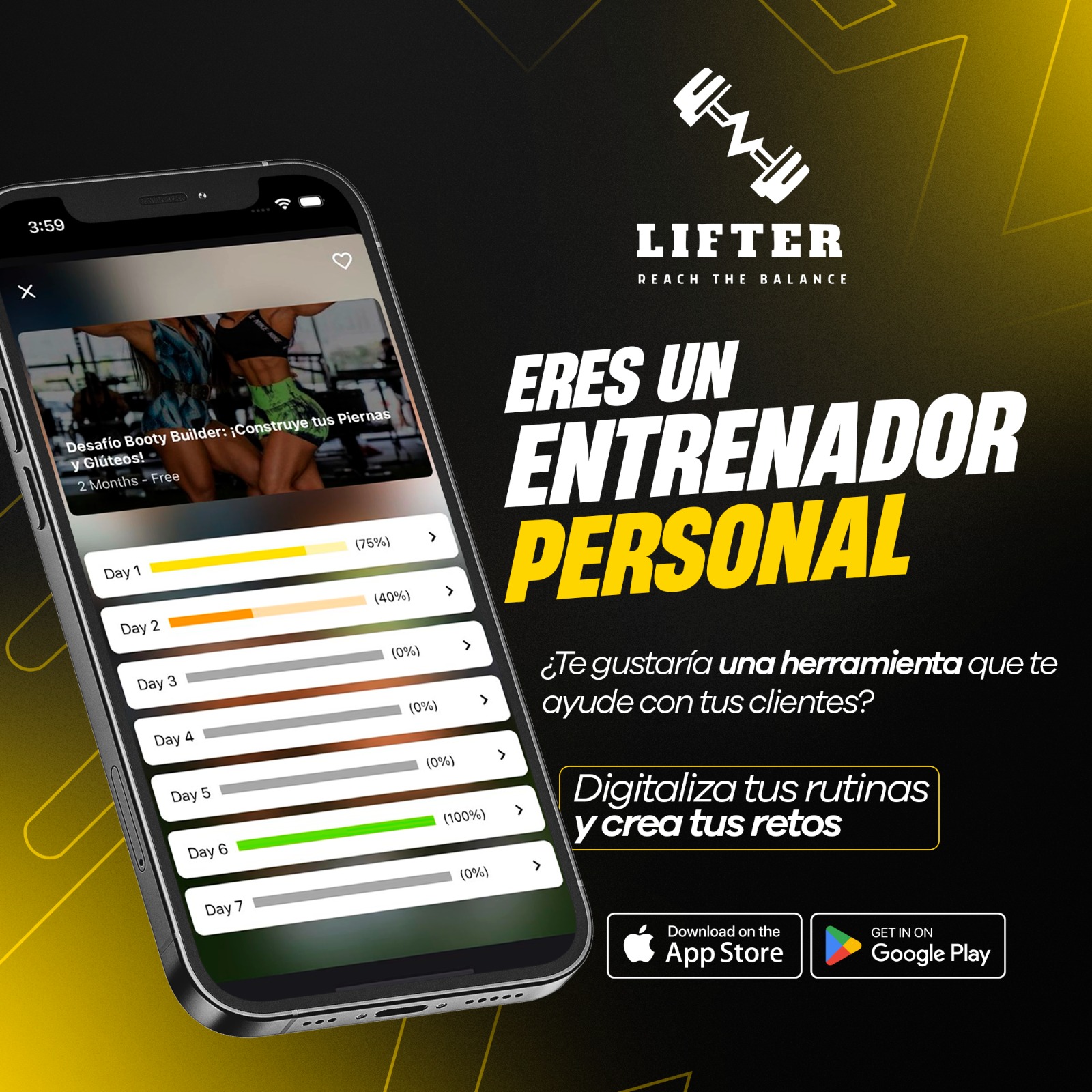 Crea usuarios a tus clientes para que ejecuten tus rutinas o retos desde el App Móvil (Lifter), con videos, imágenes e indicaciones paso a paso, todo este contenido personalizado por ti.
